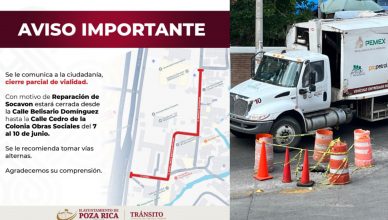 Cierran vialidad en el Palacio Municipal de Poza Rica por reparaciones junio 7, 2025junio 30, 2025Redaccion > Recomiendan a la población tomar sus precauciones. Poza Rica, Ver.- Este sábado, domingo, lunes y martes, la calle Belisario Domínguez permanecerá cerrada [...]