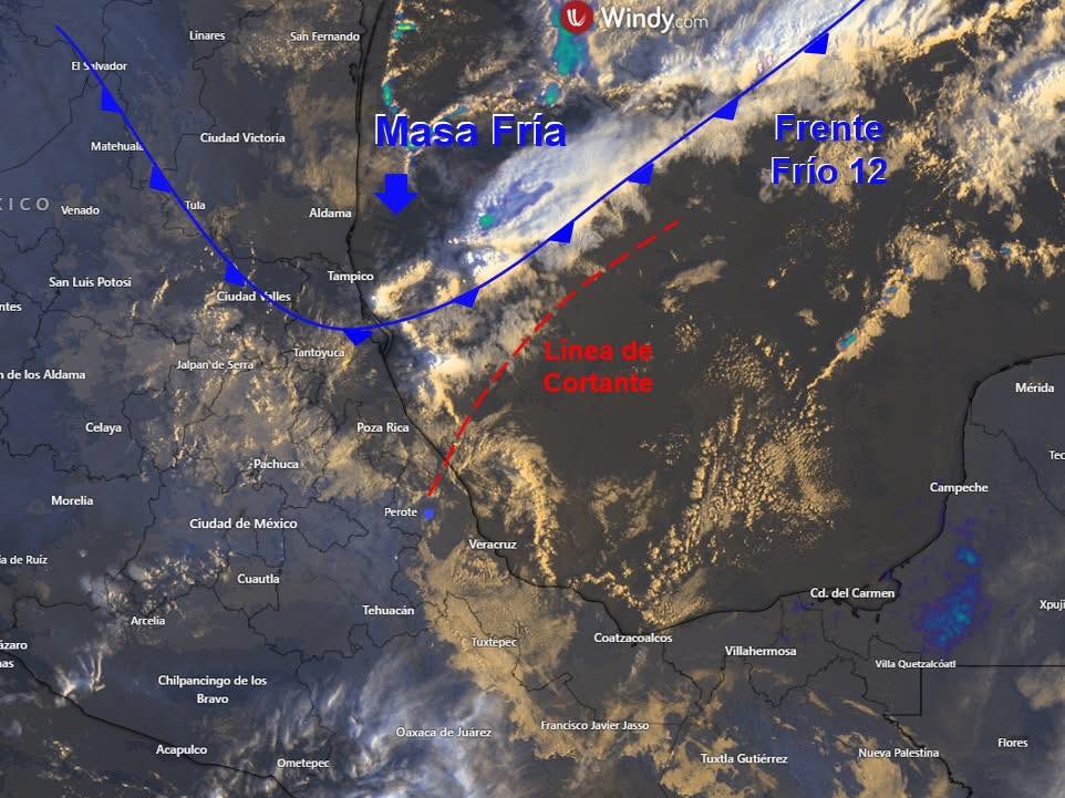 El frente frío 12 se desplaza por el norte del estado de Veracruz, asociado a una Línea de Cortante que logra llegar a la zona de Nautla y que anticipa el cambio del viento al Norte. Ambos sistemas ocasionan aumento de nublados con potencial para lluvias y tormentas (viento arrachado, descargas eléctricas, posibles granizadas y en ocasiones torbellinos), esperándose que el frente se mueva mañana sobre la Península de Yucatán.