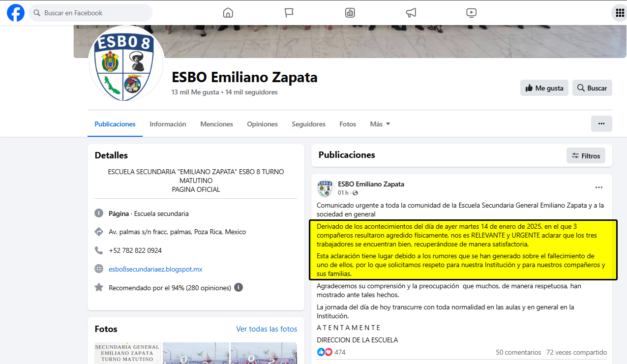 Asimismo, en la cuenta de Facebook ESBO Emiliano Zapata se difundió un comunicado donde se resaltó lo siguiente: