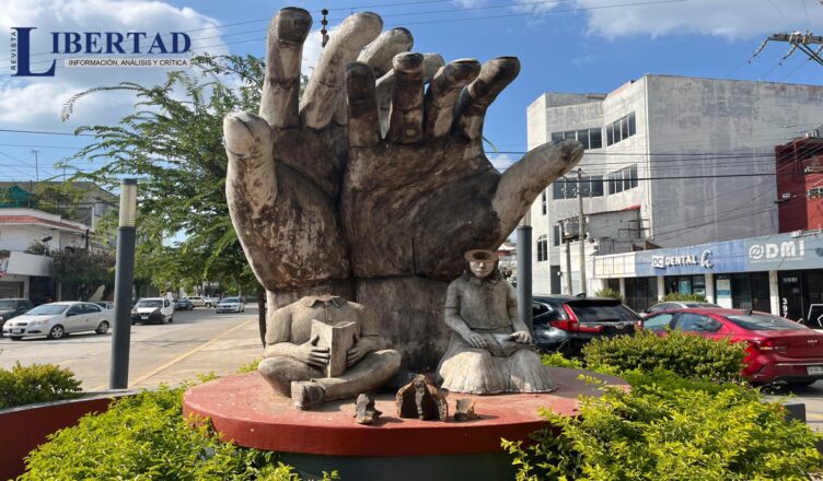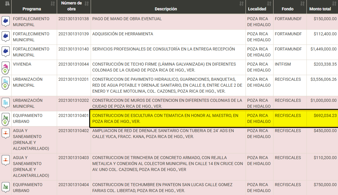 También calificada por muchos como unas manos espeluznantes acechando a dos niños, es descrita en el Sistema de Consulta de Obras y Acciones Municipales de Veracruz del ORFIS como “Construcción de Escultura con Temática en Honor al Maestro” con un monto de $692 mil 34.23 pesos.