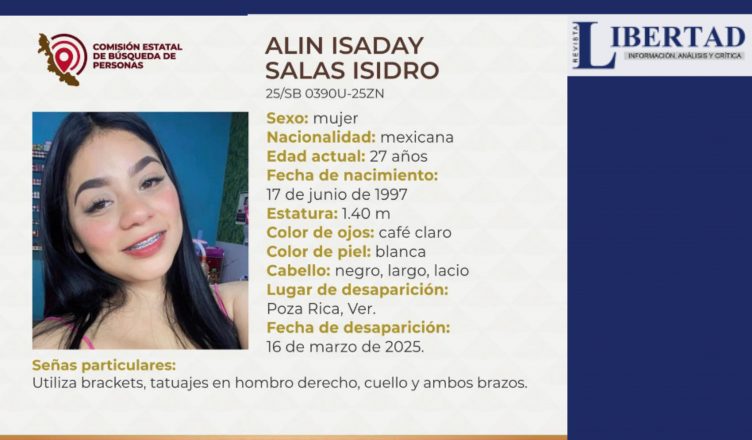 Poza Rica, Ver.- La Comisión Estatal de Búsqueda de Personas de Veracruz emitió una ficha con la foto y datos relevantes en torno a la desaparición de Alin Isaday Salas Isidro y hacen un llamado a la sociedad para brindar cualquier información que pueda ayudar a su localización al teléfono 2283193187.